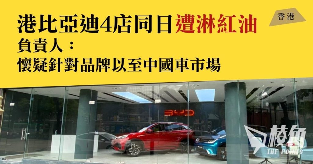 香港時間今晨約早上4時,比亞迪位於尖沙咀的陣列室外牆遭人淋紅油,及後該品牌於灣仔及天水圍的分店被發現同樣遭人淋紅油;而元朗分店則被人用一輛沒有行車證的私家車撞毀鐵閘,犯人及後棄車離開。