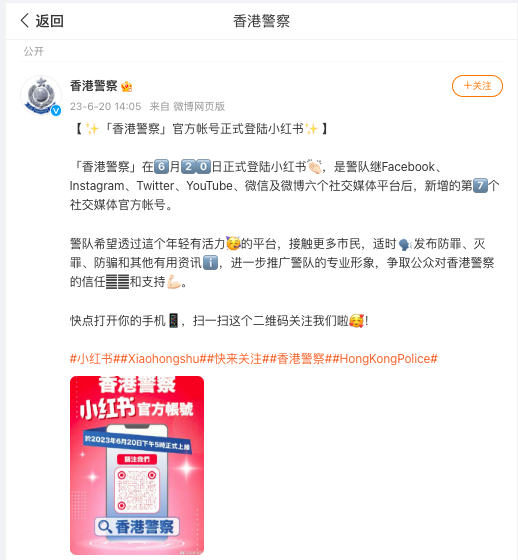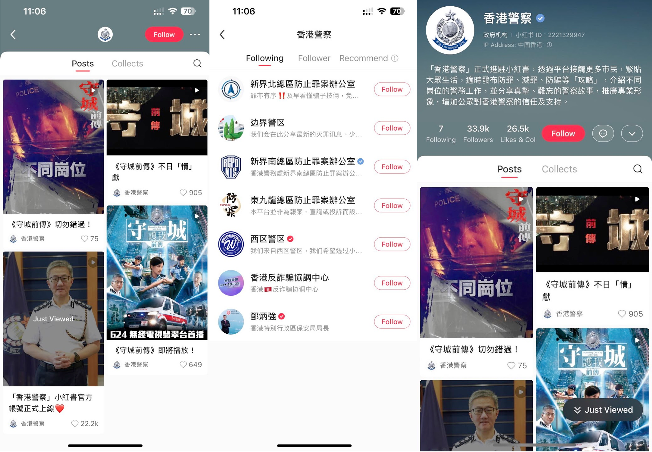 小紅書帳號開設後一天,專頁共上載了四個帖文,皆為宣傳警隊拍攝的《守城前傳》,專頁至今有逾三萬人追蹤,約二萬六千人曾讚好或留言;專頁亦有追蹤保安局局長鄧炳強及多個香港警察部門及地區分支,如西區警區及反詐騙協調中心等,但兩者均沒有官方Facebook專頁。