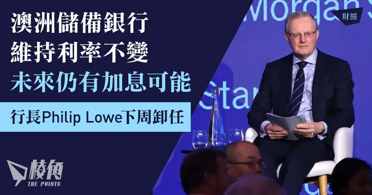 澳洲儲備銀行宣布官方利率維持在4.1%,這是自7月以來連續第三個月維持利率不變。儲備銀行表示,未來或有需要進一步加息,以確保通脹受到控制。行長Philip Lowe將於下周卸任,由Michele Bullock接替。