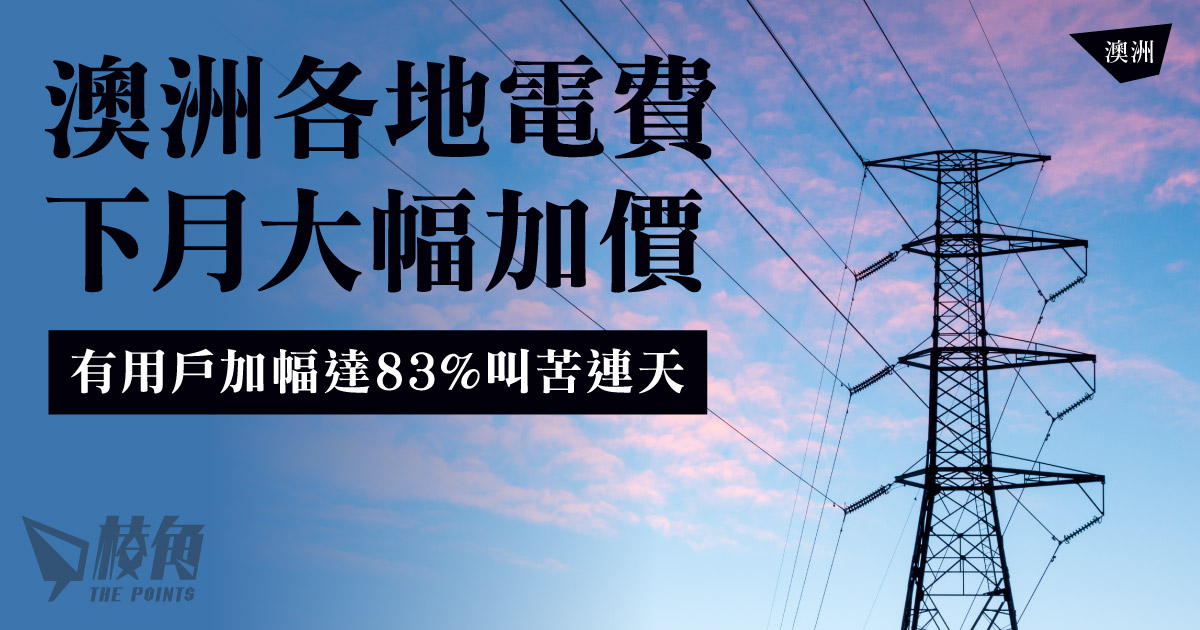 自7月開始,澳洲各地電價將大幅加價,不少電力公司AGL的客戶收到通知,將會大幅加價,由30%至50%不等,甚至有客戶表示他收到加價83%,真的感到很瘋狂。澳洲能源監管機構(AER)證實,從7月1日開始,約60萬的客戶電價將提高20%至25%,客戶已被告知冬季電費可能會劇增。