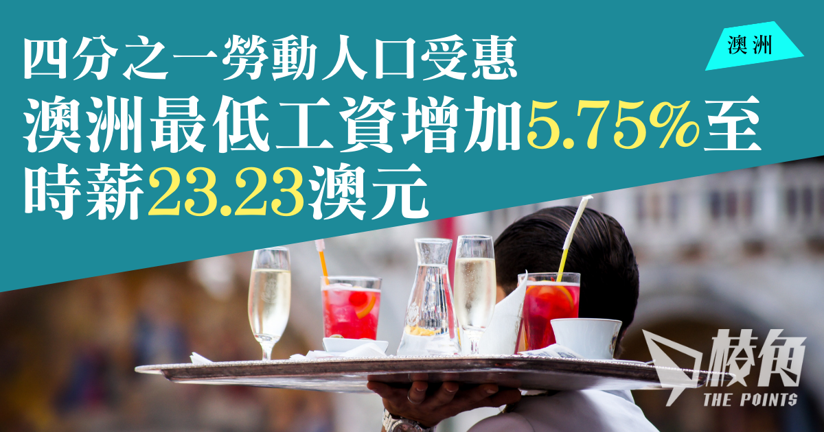 澳洲公平工作委員會 (FWC)宣布,澳洲從7月1日起將全國最低工資提高5.75%至時薪23.23澳元,每周882.80 澳元,每周工作 38 小時,以應付生活成本上升。這一決定將直接影響到約270萬名最低工資僱員和許多受工資標準影響的僱員,並對澳洲的勞工市場產生重要的影響。這一加薪措施目的是提高低收入僱員的生活水平,減少貧困和不平等現象。
