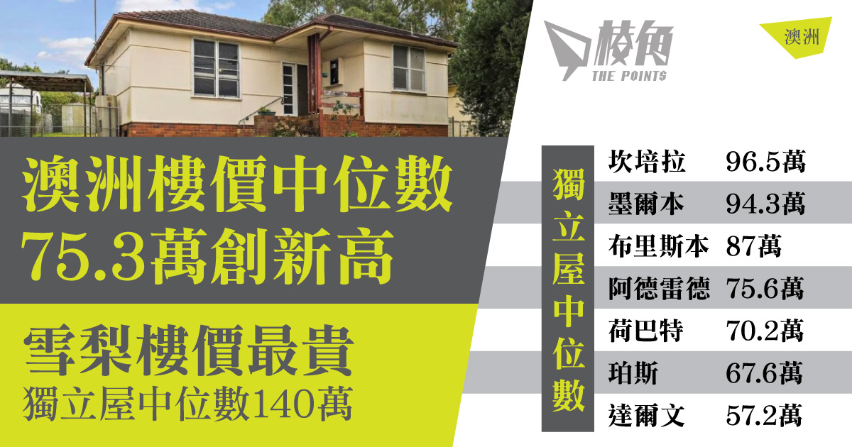 澳洲儲備銀行最近宣佈不加息,澳洲各州樓價過去雖受到加息影響,但由於供應追不上需求,大部分地區的樓價走勢仍見有輕微上升。最新的房屋價值中位數達753,654澳元,創下歷史新高。雪梨仍是全國樓價最貴的地方,獨立屋中位數接近140萬澳元。就首府城市房產價格在11月的變動,珀斯位居榜首;墨爾本、荷巴特和達爾文的房價則略有下降。