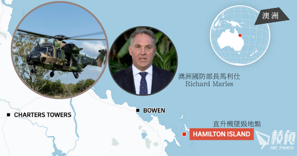 7月28日深夜,澳洲及美國在昆士蘭海岸Whitsunday海域進行聯合軍演,期間一架澳洲陸軍Taipan MRH90型直升機墜機,4名機組人員失踨,目前仍在搜救。澳洲國防部長馬利仕Richard Marles證實消息,並指當時直升機正進行夜間訓練任務。