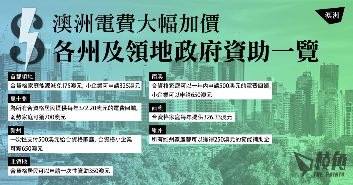 澳洲新財政年度,各州電費開支將大幅增加,部分州及領地的電費增幅高達25%。聯邦政府今年5月宣布33億澳元的能源費用紓困基金(Energy Bill Relief Fund)。各州及領地正磋商如何分配資助及居民和小企業。而各州及領地亦有各自的能源費用回饋及優惠。