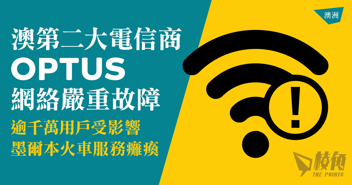 澳洲第二大電信商Optus手機網絡及互聯絡由今早凌晨4點起全國故障,超過1,000萬用戶和40萬家企業受到影響,無法使用手機及上網。墨爾本Metro火車服務亦受到影響,出現班次延誤及取消。Optus直至截稿前,服務仍然未回復。