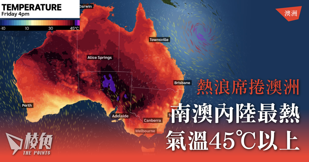南半球的澳洲已進入夏季,但今周才迎來首個熱浪警報。氣象局發出熱浪預警,自周三開始為期三天。從西澳西北部向東南中部紅土中心地區,再到昆州西部和新州,都會受到熱浪影響,當中南澳內陸地區最嚴熱,氣温可達到45℃以上。