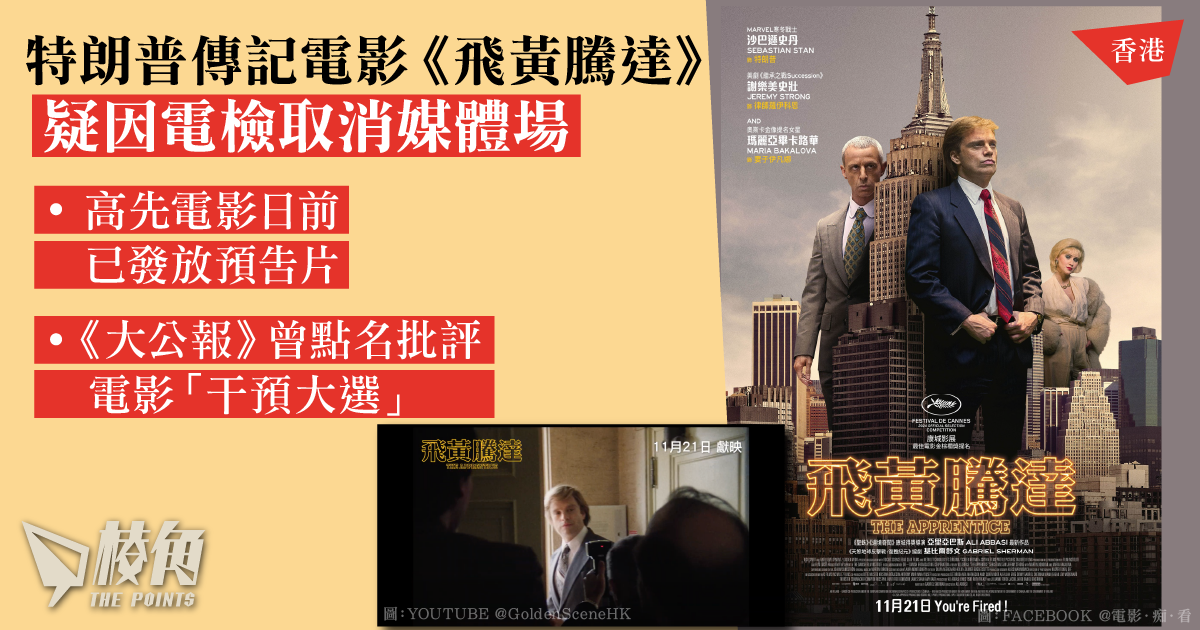 美國總統大選下月初舉行,拉票造勢等活動進行得如火如荼,其中一名總統候選人特朗普的傳記電影《飛黃騰達》(THE APPRENTICE)最近全球上映備受爭議。電影原定下周四(10月31日)在高先電影院舉辦媒體優先場,據報因「電檢問題」被取消。《棱角》就事件向香港發行商高先電影查詢,截稿前未有回覆。高先電影周二(22日)發佈預告片,指電影將於11月21日上映。