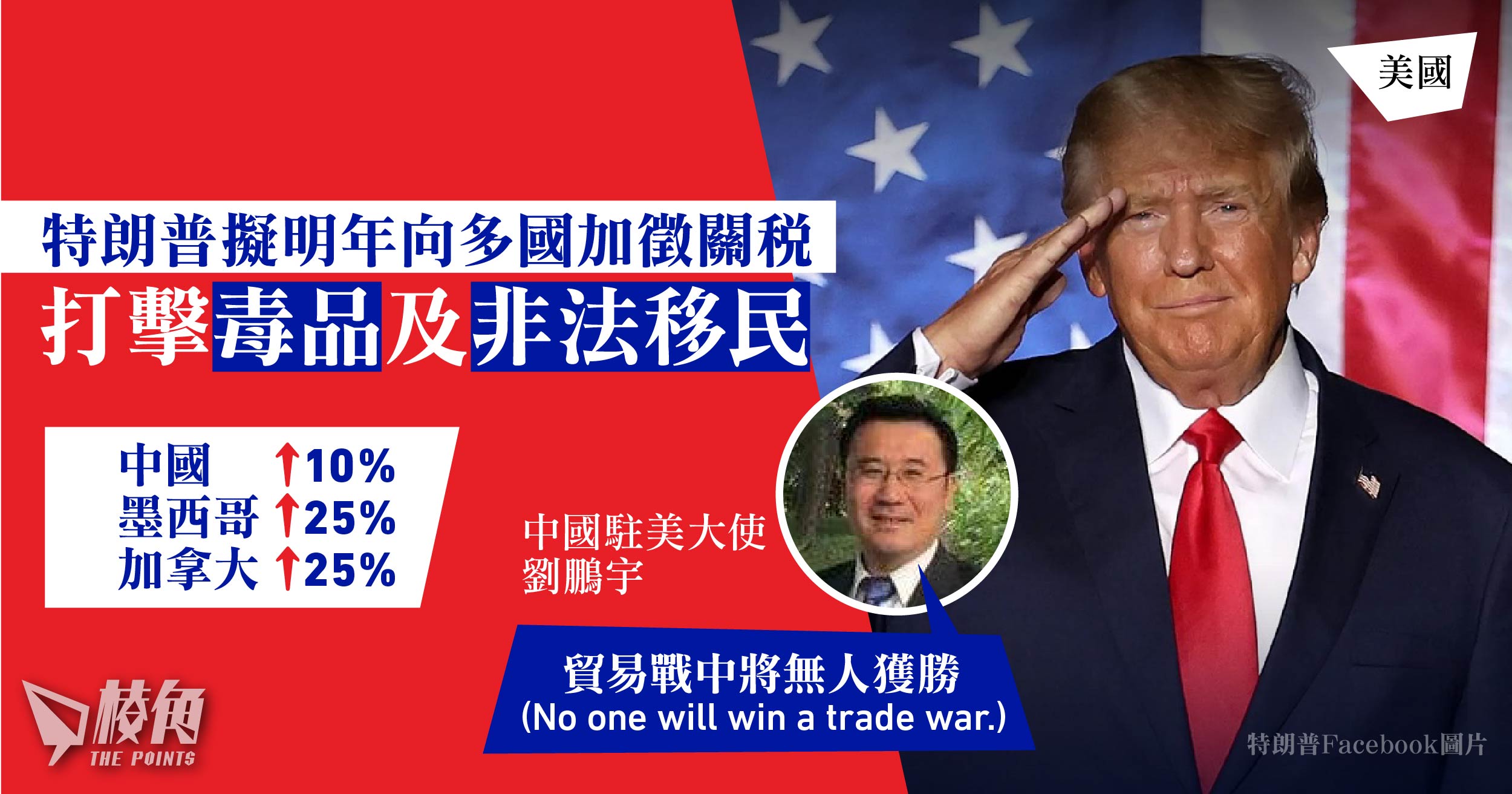 早前當選美國總統特朗普周一(25日)宣布,上任向多國加徵關稅,包括對中國進口商品加徵10%關稅,以打擊非法藥物流入;及對墨西哥和加拿大的所有進口商品加徵25%關稅,逼使兩國落實措施阻止非法移民。中國駐美國大使館回應加稅消息,形容貿易戰及關稅戰不利任何一方,又強調中方已加強禁毒措施,批評美方的指控與現實不符。
