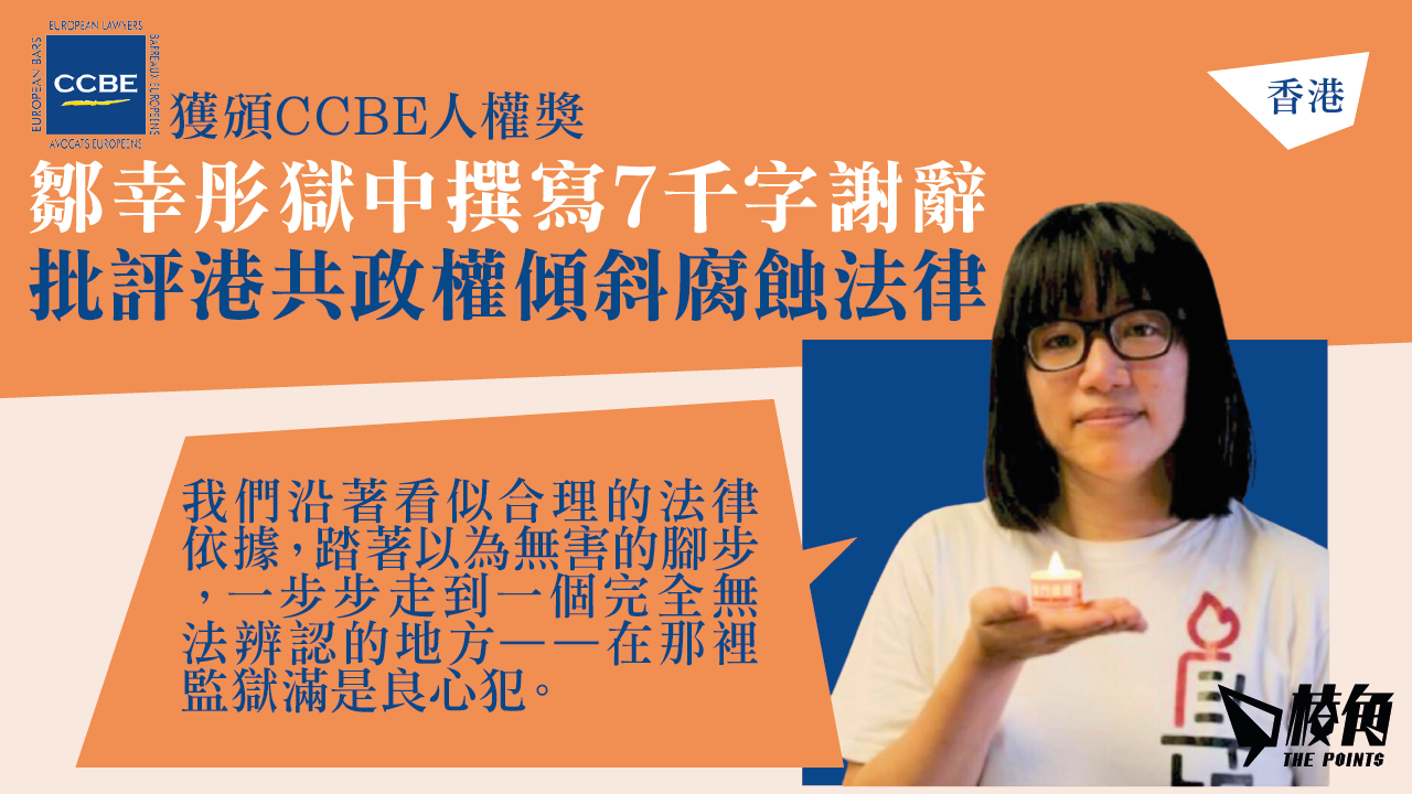 歐洲律師協會委員會(The Council of Bars and Law Societies of Europe,下稱委員會)上周三(22日)宣布,被控「煽動顛覆國家罪」支聯會前副主席鄒幸彤、中國維權法律學者許志永及丁家喜,共同獲頒2023年人權獎。鄒幸彤社交平台專頁周五(24日)刊登鄒在獄中撰寫的謝辭,逾7千字闡述中共及港府政權如何逐步蠶食香港法治,及有關法律、權力、公義與價值觀的連鎖關係。