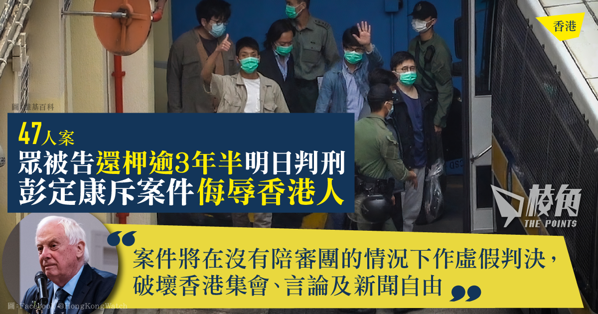 2021年3月,47名民主派人士參與初選被控「串謀顛覆國家政權」案,是《國安法》實施後涉案人數最多的案件,受國際關注。45名被告今年5月被判罪成,當中32人還柙至今逾3年8個月,周二(19日)判刑,不設陪審團。前港督、香港監察贊助人彭定康勳爵在判刑前夕發聲明,形容案件是港府對香港人的侮辱,譴責案件將在沒有陪審團的情況下作虛假判決,呼籲英國政府絕不能忽視案件的判決。