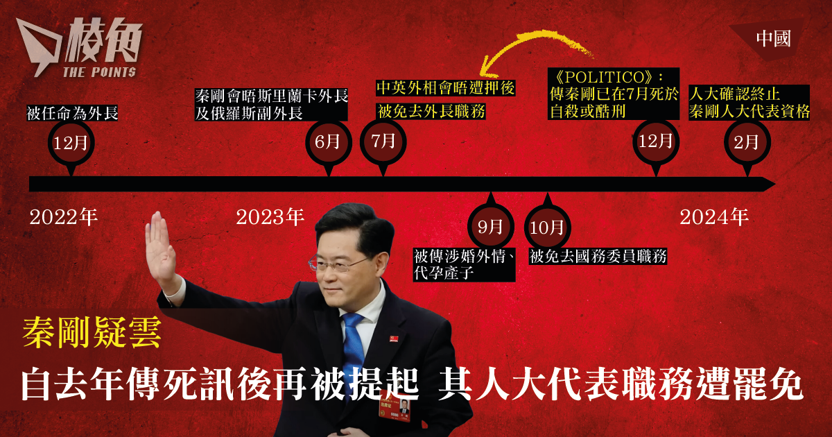 - 秦剛自去年6月後再沒有公開露面,12月更傳出死訊