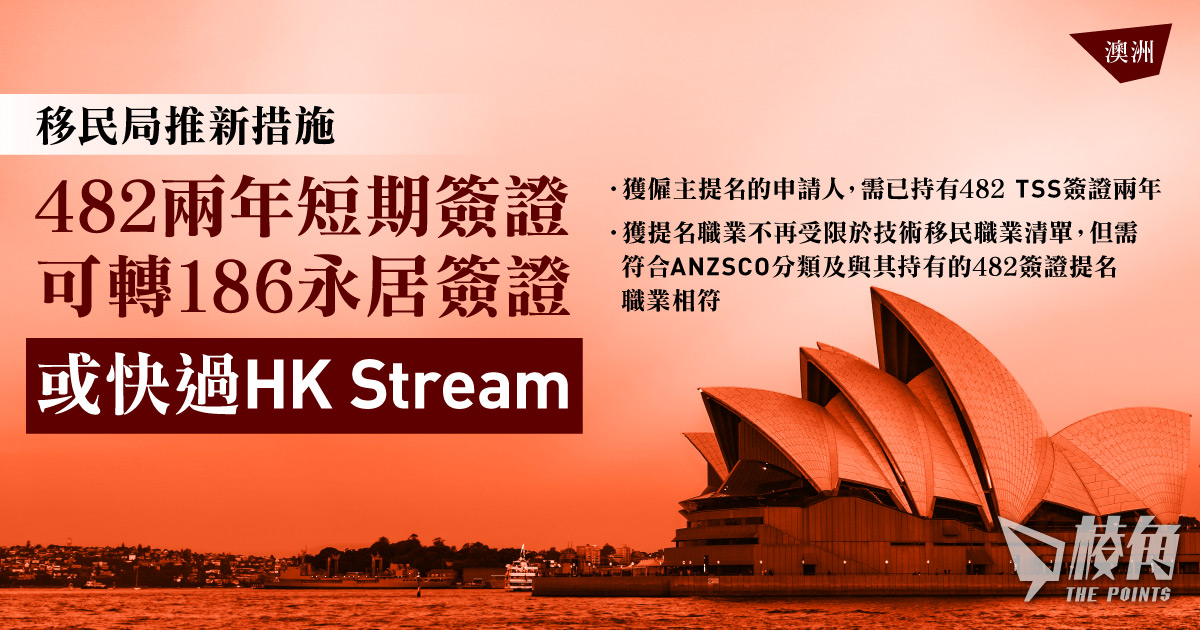 澳洲政府內政部日前公佈新臨時技術短缺簽證 (Temporary Skill Shortage; 簽證類別 482),申請永居簽證途徑。所有482類別的簽證持有人都能夠通過186 僱主擔保簽證 (subclass 186) 成為永久居民。簽證持有人只需為合資格僱主工作兩年便符合資格,時間比通過Hong Kong Stream取得永居更快,不過此途徑對45歲以上人士有限制,只有從事醫療行業人士才可以豁免。