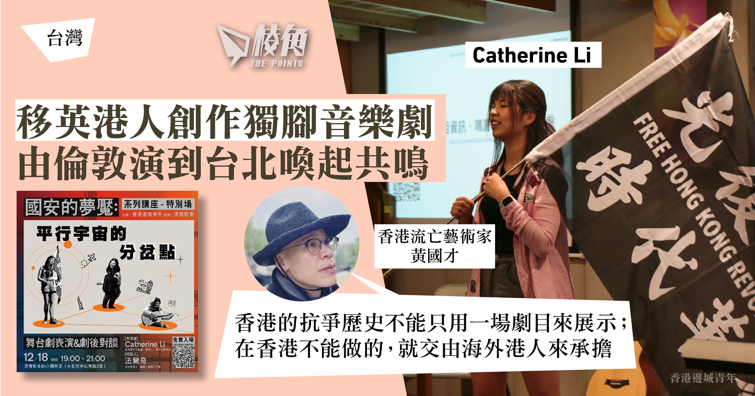 反修例運動五年,再有海外港人用藝術寫下香港歷史。台灣港人組織「香港邊城青年」周三在台北濟南教會舉辦講座,特別邀請移英藝術抗爭者Catherine Li演出一人音樂劇,回顧海外港人的心路歷程,引起觀眾討論與反思。移居台灣的流亡藝術家黃國才認為,演出元素豐富,令他很有共鳴,希望有更多海外港人勇於創作,記下香港的抗爭史。