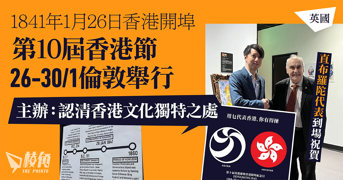 1841年1月26日,香港開埠,英國港人團體「香港繆詩菴」(Museum of Hong Kong)繼去年於香港開埠日首次在倫敦主辦《香港節》後,今年規模更大,聯合14個港人團體,於香港開埠182周年,舉辦第10屆《香港節》(Festival of Hong Kong)。活動於1月26日開始一連5日,涵蓋展覽、講座及音樂會等,免費入場。《香港節》旨在傳承香港歷史文化,讓人了解香港文化獨特之處。