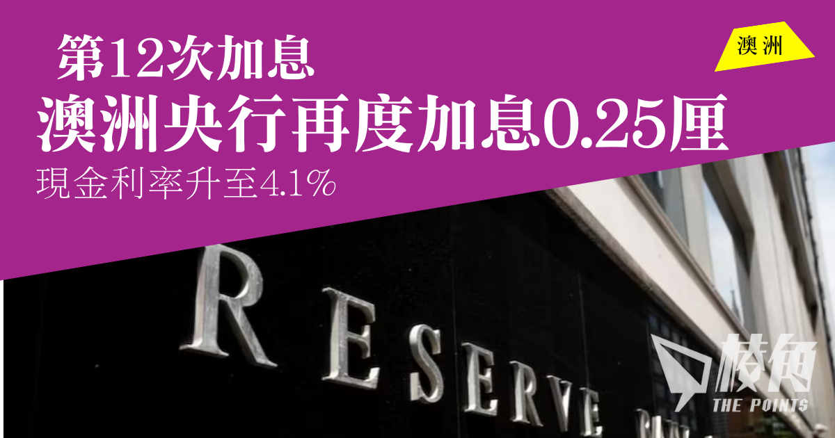 澳洲儲備銀行今日(6月6日)議息後,決定自去年 5 月以來,進行第 12 次加息,期望透過提高利率以應付持續高企的通脹。該行宣布加息0.25厘至4.1厘,是2012年4月以來最高水平,令一眾預期6月將維持利率不變的專家大跌眼鏡。該行指出,雖然有數據顯示通脹已見頂回落,但高達7%的水平仍然偏高,重回目標水平範圍仍有一段距離,相信進一步加息可增強市場對通脹在合理時間回到目標水平的信心,該行委員會決心將通脹恢復到目標水平,不排除進一步收緊貨幣政策。