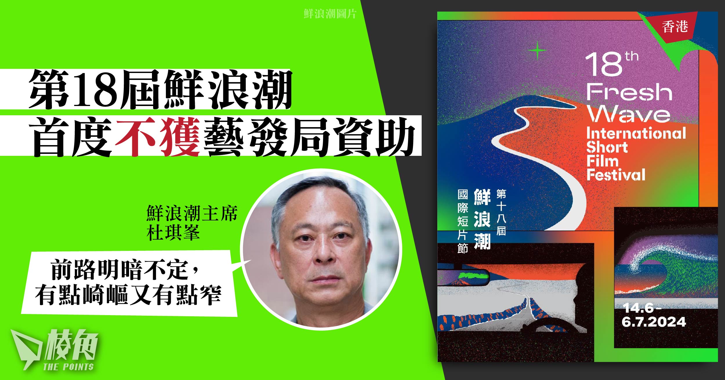 第18屆鮮浪潮國際短片節將於周五(14日)舉行,首度不獲香港藝術發展局資助。鮮浪潮電影節表示,自成立有限公司起財政已逐漸獨立,過去藝發局仍有資助支持不同活動,最終決定停止資助並非不尋常。鮮浪潮主席杜琪峯表示,香港電影的大環境存在各種嚴峻挑戰,「前路明暗不定,有點崎嶇又有點窄」,但仍會不懈探尋資源發展香港電影。