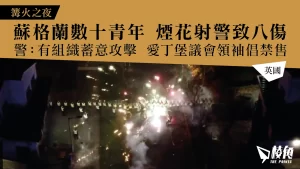 英國本周末剛經歷傳統節慶「篝火之夜」(Bonfire Night),全國各地均有民眾燃放煙花慶祝。然而周日(11月5日)在蘇格蘭愛丁堡市郊,有數十名青年聚集並以煙火和燃燒彈向在場的防暴警察射擊,導致多名警員受傷。在格拉斯哥和登地(Dundee),亦出現了類似針對警察的攻擊。蘇格蘭警方表示在篝火之夜的衝突中共有八名警察受傷,又譴責事件是有組織的蓄意攻擊。而愛丁堡市議會領袖則倡議禁止向公眾售賣煙火。