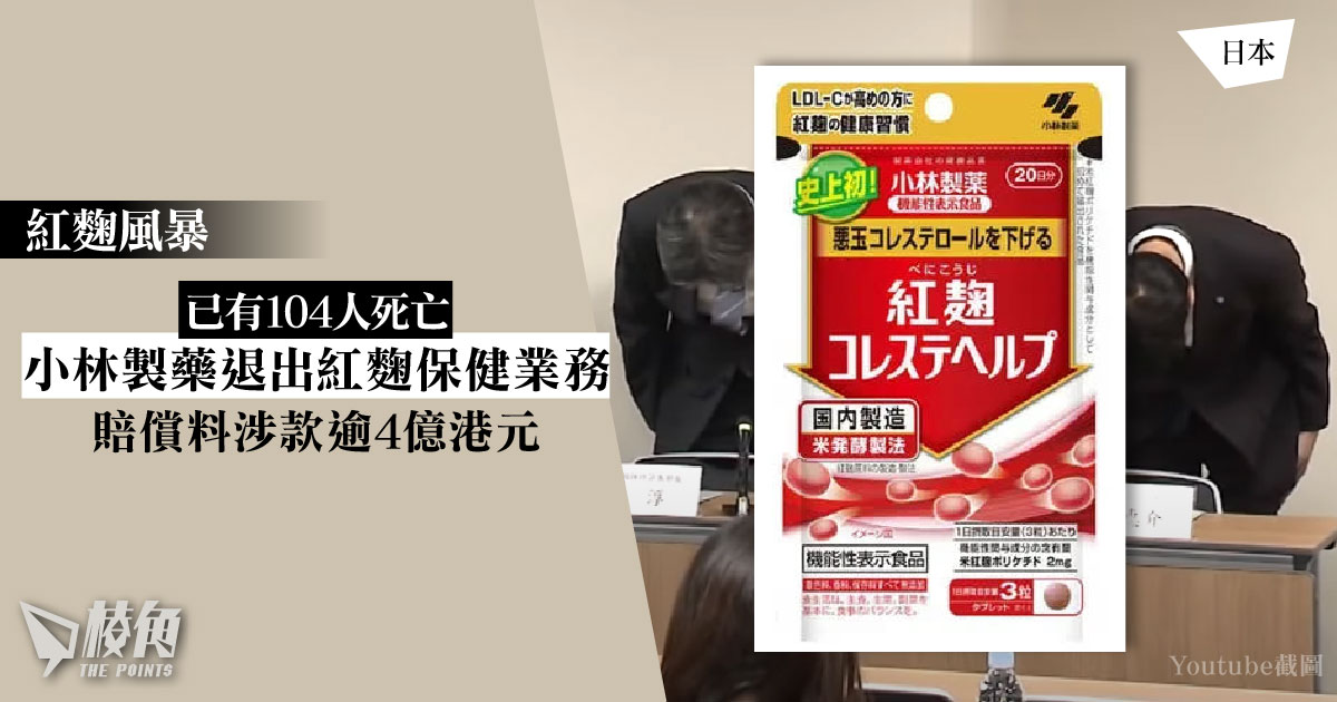 有消費者服用小林製藥含紅麴成分保健食品後腎功能受損,自今年3月至今已造成至少104人死亡。小林製藥公司宣布,退出紅麴業務,將停止產品製造及銷售,同時計劃在8月19日起對服用相關保健品導致健康受影響的人士,賠償住院、醫療及停工等費用,預計涉款79億日圓(約4.16億港元)。