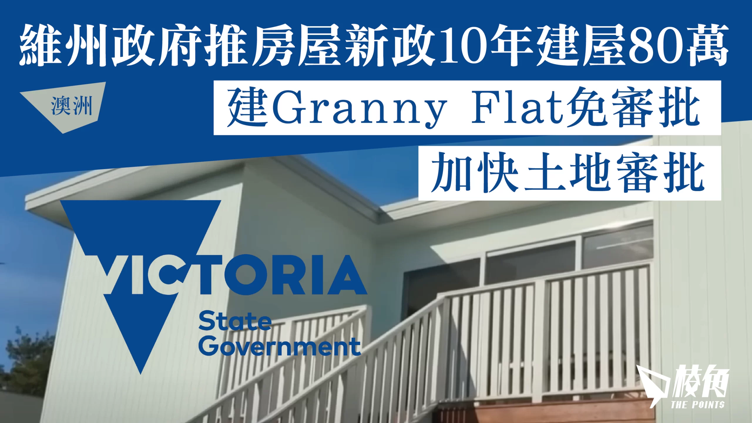 澳洲維州政府推出一系列房屋新政策,期望在未來10年可以提高房屋供應,達到80萬住宅單位,當中包括免審批興建俗稱「祖母屋」(Granny Flat)的附設於獨立屋的迷你屋,簡化審批開發及土地再發展程序,增收Airbnb等短期住宿附加稅等。