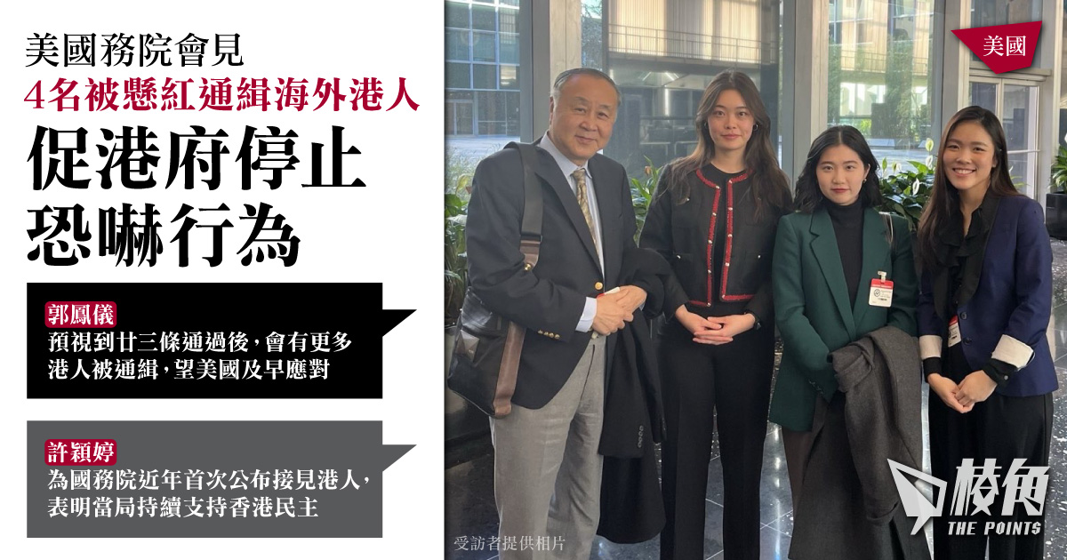 美國國務院轄下的民主、人權和勞工事務局(Bureau of Democracy, Human Rights, and Labor)於周一(5日)與4名被港府以違反《國安法》各懸紅100萬港元通緝的海外港人,包括郭鳳儀、許穎婷、邵嵐及袁弓夷會面。會後當局於其社媒X上讚揚他們面對持續的打壓,但仍然在其人權工作上展現出勇氣和堅持,並促請香港政府「立即停止一切恐嚇香港和世界各地人民的行為,包括以美國為家的人」。