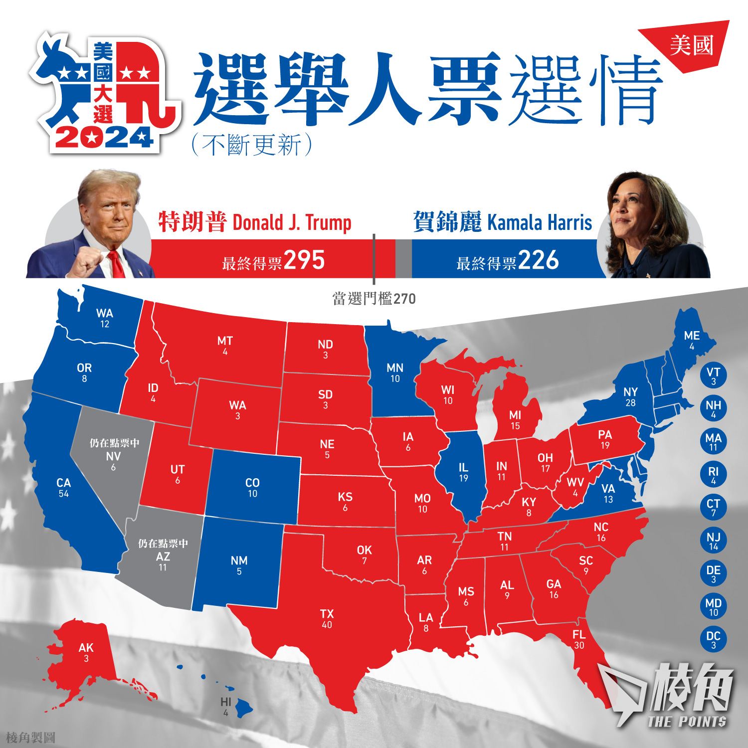 美國大選票站陸續關閉,點票工作接近完成。根據《美聯社》最新點票結果,截至11月7日美國東部時間凌晨5時,共和黨總統候選人特朗普(Donald Trump)最新票數為295票,民主黨總統候選人賀錦麗(Kamala Harris)則奪得226票。目前僅剩亞利桑那州與內華達州仍在點票,特朗普於兩州皆處於領先位置。