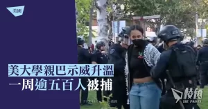 - 美國多地警方近日在全美多家大學校內針對紮營抗議、聲援巴勒斯坦的學生展開清場行動,並引發警民衝突,導致一周內因親巴示威被捕的總人數超過了500人