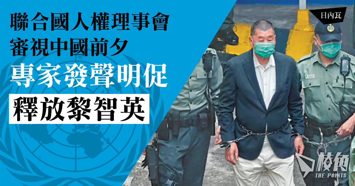聯合國人權理事會普遍定期審議(UPR)將於周二(23日)在日內瓦開會,審議中國人權狀況。會議前夕,聯合國的專家在周一(22日)發聲明,促請香港政府撤銷對壹傳媒創辦人黎智英的所有指控,並立即釋放他。