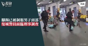 - 一名英國警察周二於曼徹斯特機場執法期間,用腳大力踢向一名已被制服在地的男子的頭部,之後再猛力踩踏