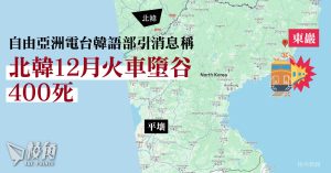 - 據自由亞洲電台韓語部報道,去年12月底,北韓一列火車發生意外墮谷,造成車上400多名乘客死亡