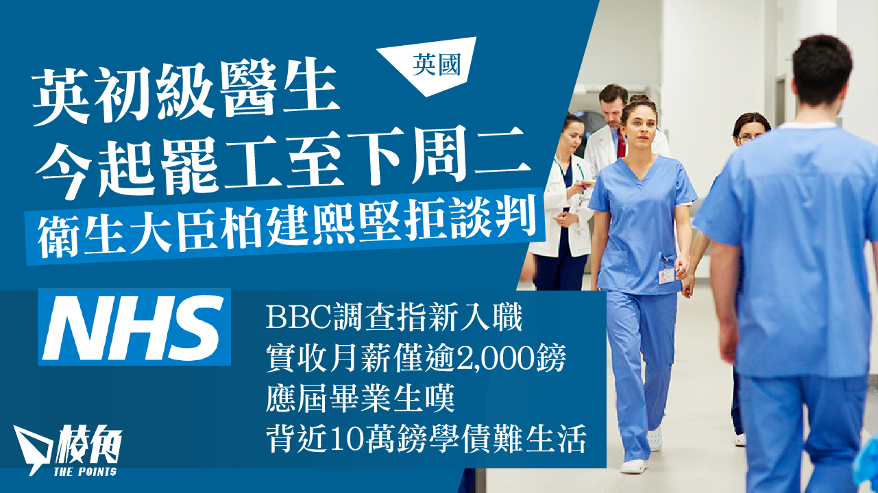 英格蘭的初級醫生與政府就加薪問題一直未能達成共識,工會方面一直爭取加薪35%以彌補多年「跑輸通脹」的損失,而政府方面則堅持早前開出加薪6%及提供一次額外£1,250補貼為最終方案,雙方未能達成共識下初級醫生今日起再罷工4天,行動至下周二早上7時結束。根據《衛報》的報道,NHS本已因疫情累積不少預約,而多次罷工行動後,目前已有約760萬病人正等候服務。