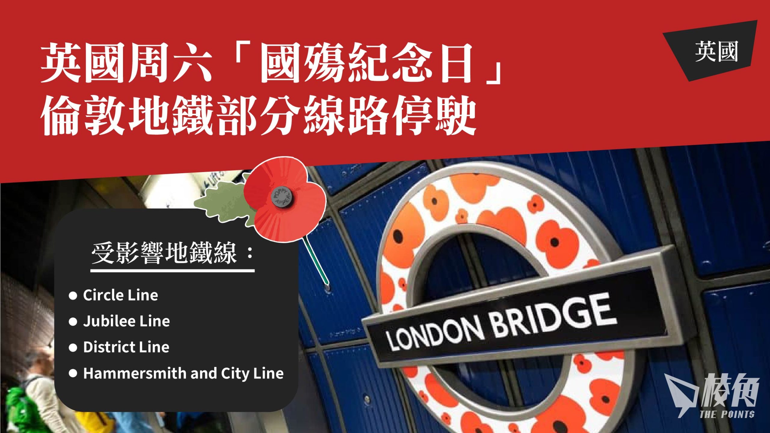 英國周六(11日)為「國殤紀念日」,倫敦市中心當地時間周六將有多場紀念活動,及聲援巴勒斯坦示威活動。倫敦交通局(TFL)早前宣布,因測試新地鐵系統,當日四條地鐵線大部分時間停駛,包括Circle Line、Jubilee Line、District Line、Hammersmith and City Line;Metropolitan Line將減少班次,部分路段停駛。