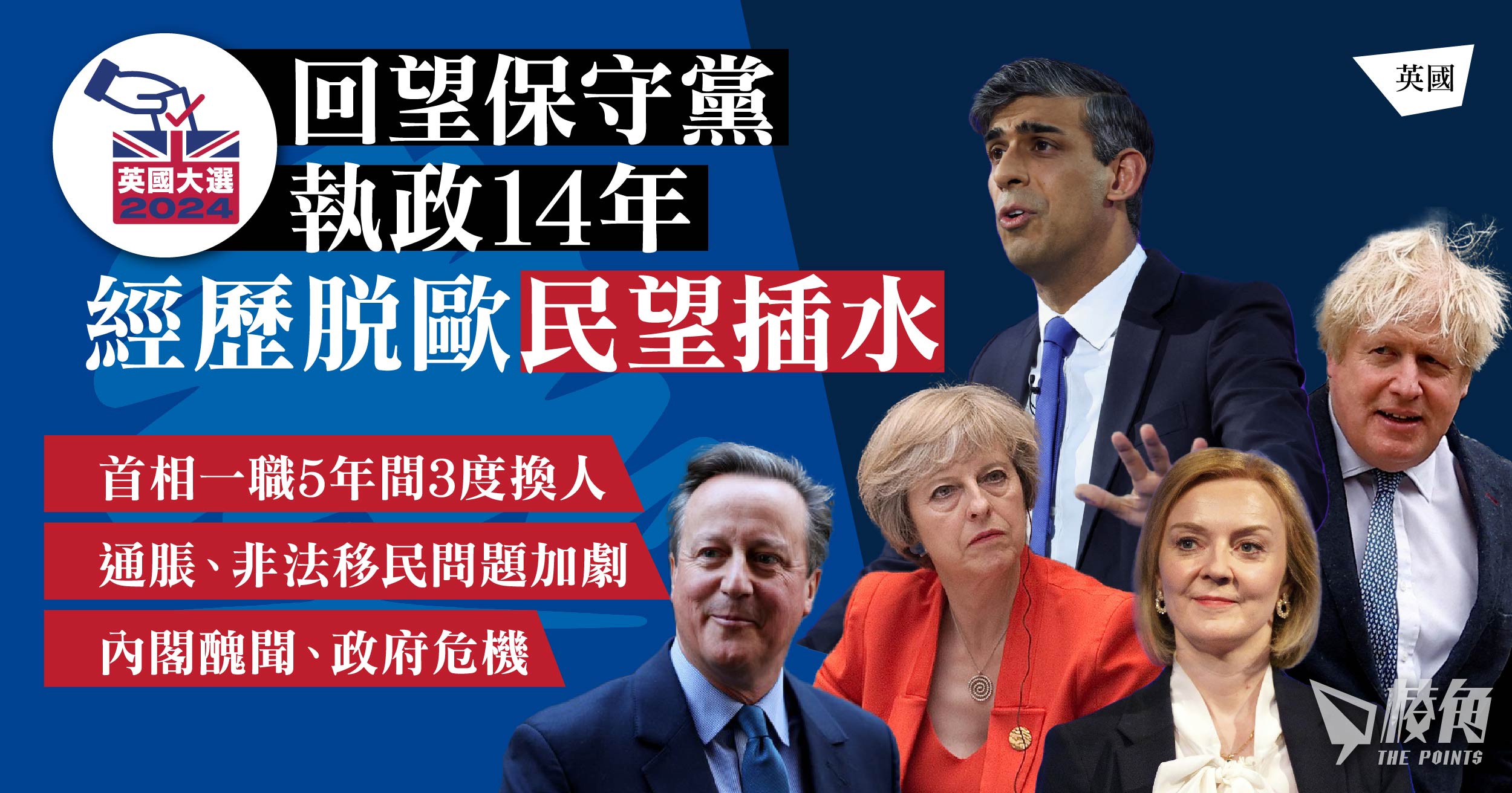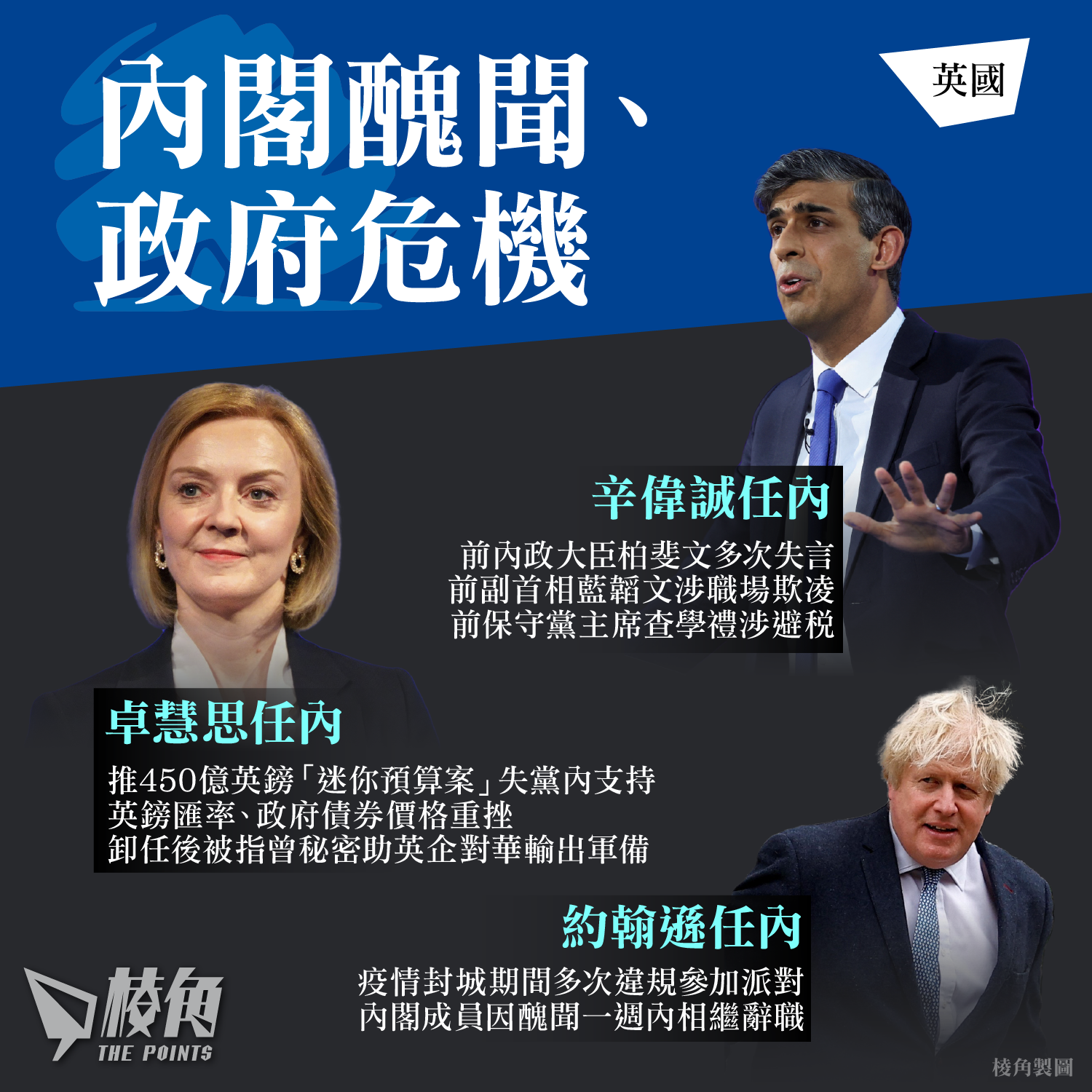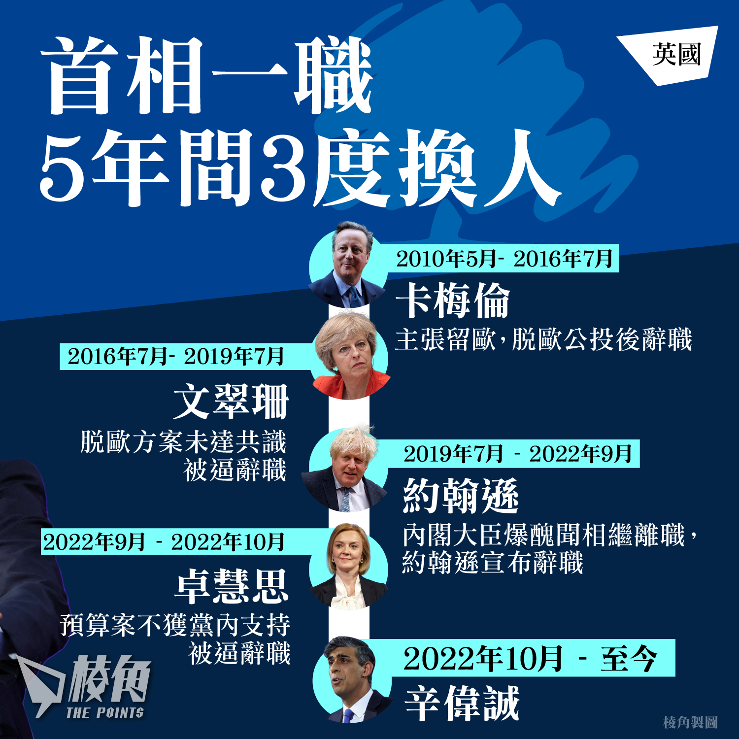 卡梅倫執政超過6年,期間「英中關係」被稱黃金時代,惟經歷脫歐公投後,主張留歐的他決定辭職。自脫歐程序開始,英國花費龐大資源配合,文翠珊上任後接替處理脫歐方案,國會多次未能達成共識,令她在黨內支持大跌,最終於2019年中旬被逼辭職。其後上任的約翰遜帶領英國完成脫歐程序及開放BNO簽證計劃,但他在疫情封城期間多次與內閣成員違規參加派對,帶動民望下滑,加上內閣大臣因不同醜聞相繼離職,約翰遜在執政約3年後最終宣布辭職。