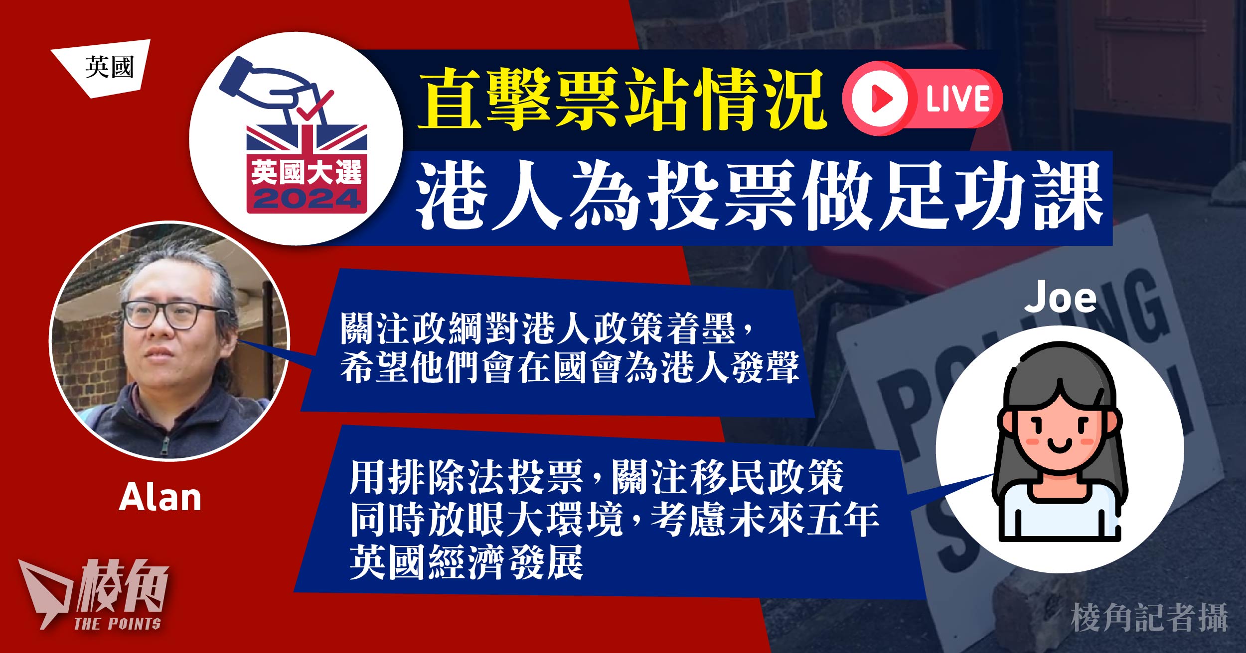 周四(4日)是英國大選投票日,是英國自推出BN(O)簽證計劃後的首次大選,尤其在較多港人聚居的選區,或有機會成為關鍵選票影響結果。《棱角》記者上午到其中一個港人熱門聚居地Sutton的票站,有完成投票的港人向記者分享心情,及對未來執政黨的期望等,他們均為今次選舉的「首投族」。票站開放至晚上10時,隨後職員會通宵點票,預料周五(5日)清晨會有初步結果。