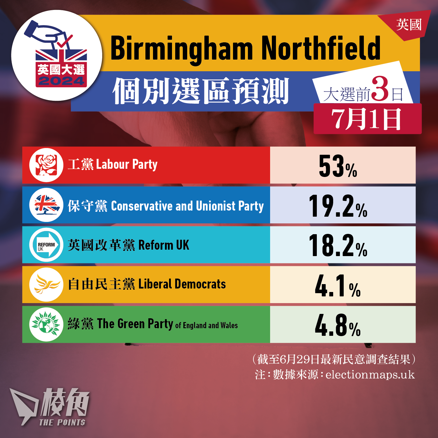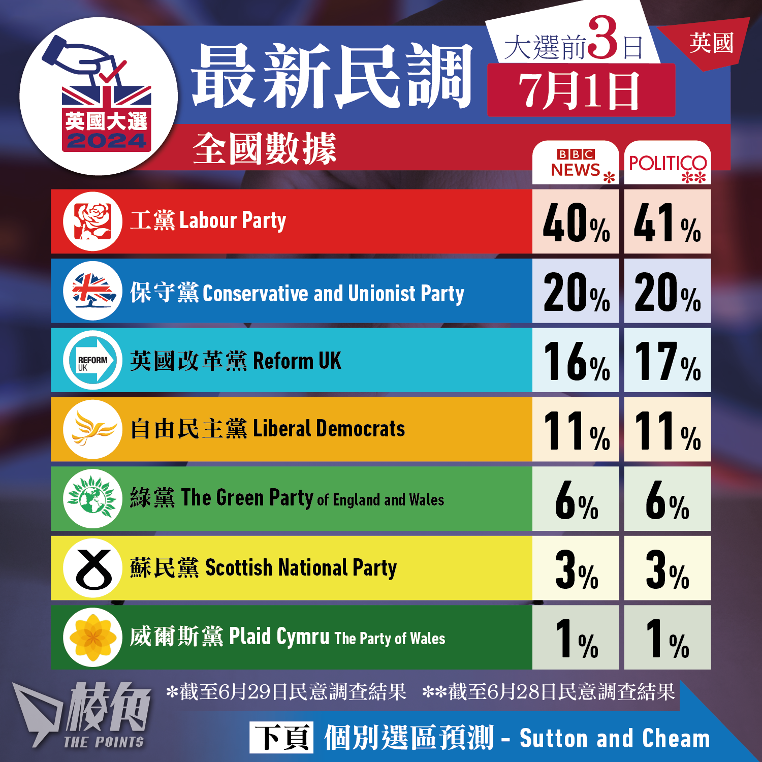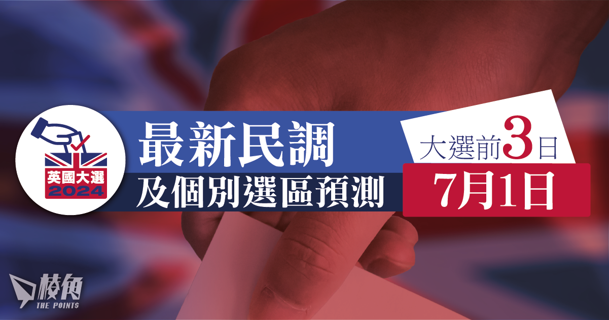 英國大選將於星期四(7月4日)舉行,亦是英國自推出BN(O)簽證計劃後的首次大選,部分移英港人將成為「首投族」。《棱角》比較《BBC》及政客雜誌《POLITICO》整理的全國民調,並於大選前適時更新數據,緊貼各政黨的支持度走勢。