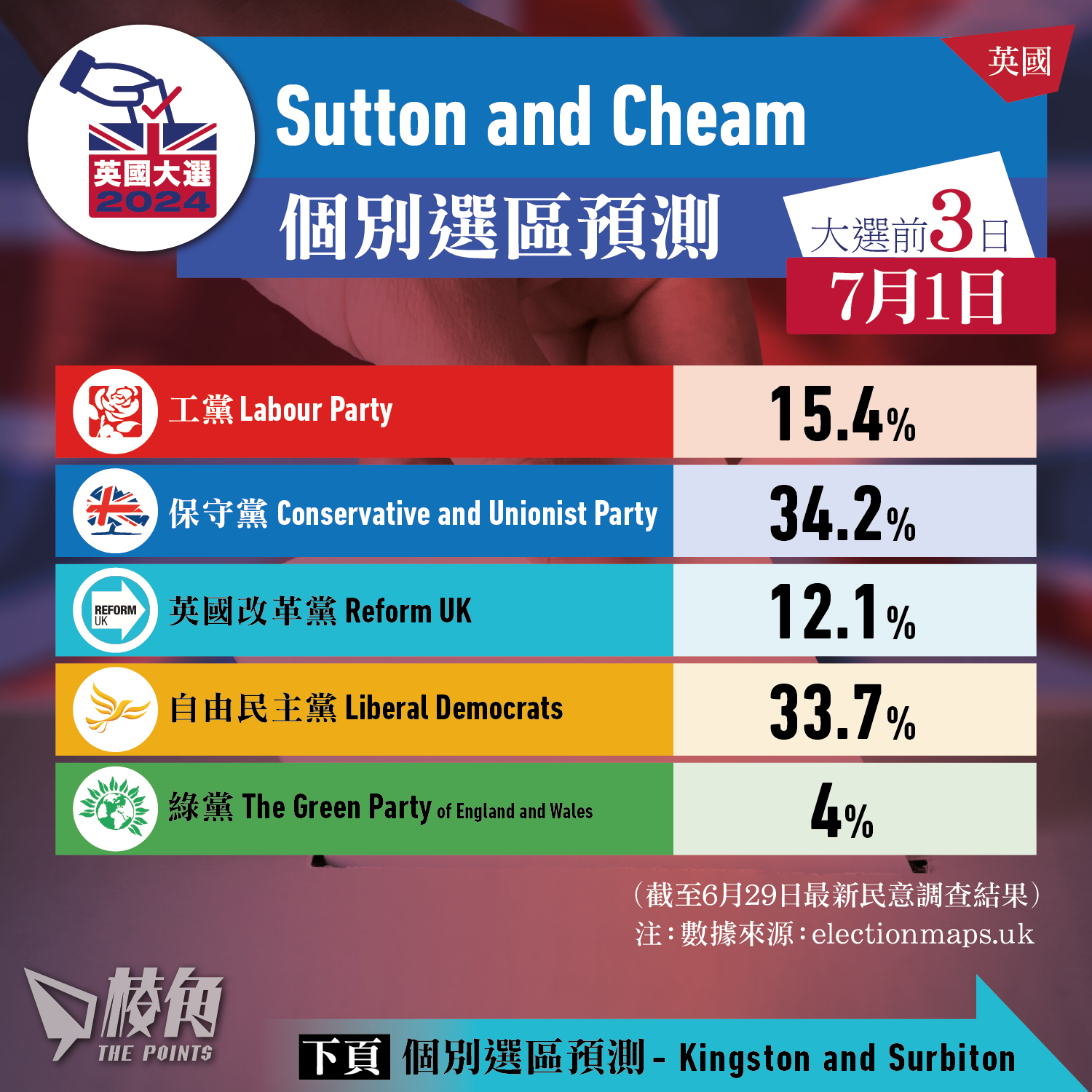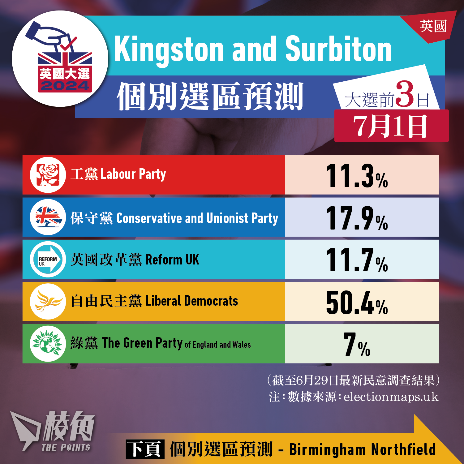 英國選舉統計網站「electionmaps.uk」設各區選情預測,《棱角》抽出其中較多移英港人所屬選區:Sutton and Cheam、Kingston and Surbiton、及Birmingham Northfield的數據予讀者參考。