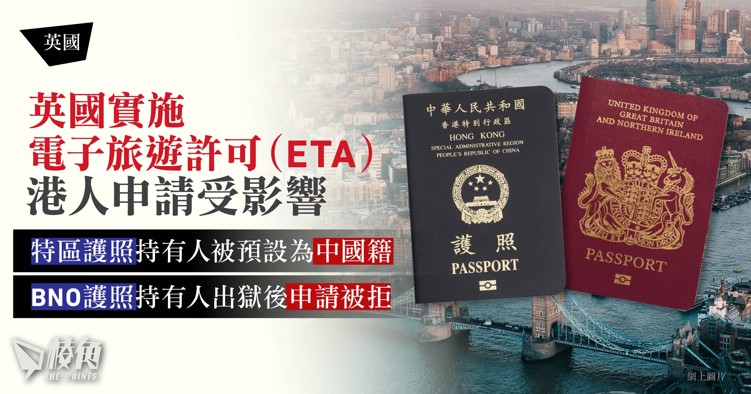 英國周三(8日)起分階段實施新電子旅遊許可(Electronic Travel Authorisation, 下稱ETA)。《棱角》發現,持特區護照的港人在申請過程中,被系統預設為「中國籍」及從「中國」出發,手動更改後卻被告知「不符合資格」。英國內政部回覆查詢,承認系統令人困惑,會積極檢討。另外,有在英港人組織發起人向《棱角》透露,有曾因集會被判監超過12個月的BNO(英國國民(海外))護照持有人,申請ETA前往英國被拒,呼籲英政府維持BNO港人免ETA入境英國的權利。