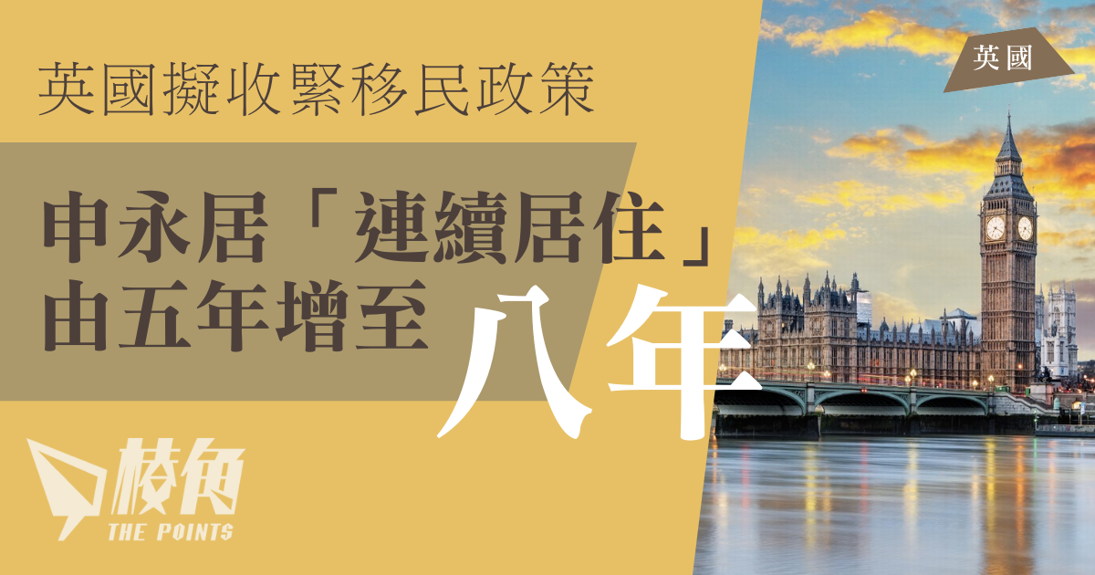 據英國《每日郵報》報道,內政部擬收緊移民政策,將申請英國永久居留權的首要條件「連續居住」(continuous residence)由5年延長至8年,與其他歐洲國家的申請條件相近。報道又引述政府消息指,政府亦正考慮修改或加入其他申請條件,包括要求申請人曾在英國工作或讀書兩年或以上、過去10年內沒有犯罪紀錄、及取消豁免65歲以上人士通過英國生活知識測試(Life in the UK Test)等。