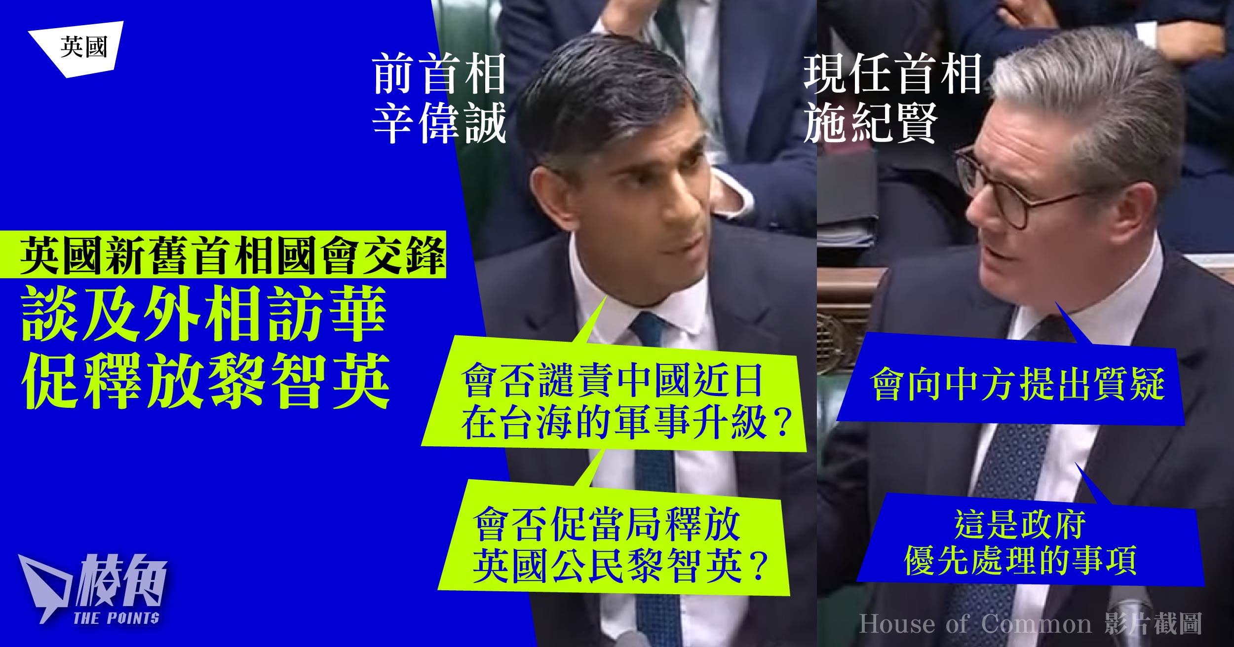 英國外相林德偉將於周五(17日)應中國外長王毅邀請首次訪華兩天,此前,新舊首相在國會交鋒,前首相辛偉誠就外相訪華及國安問題等,向現任首相施紀賢提出質詢,辛偉誠問及外相會否就近日中國在台海的軍事升級譴責中國,及會否向當局要求釋放《壹傳媒》創辦人黎智英。施紀賢直言與中國仍有貿易等合作,但會就人權及價值觀問題向中方提出質疑,又指敦促香港釋放黎智英是政府的優先事項,外相亦會在與王毅的會晤中提出此案。