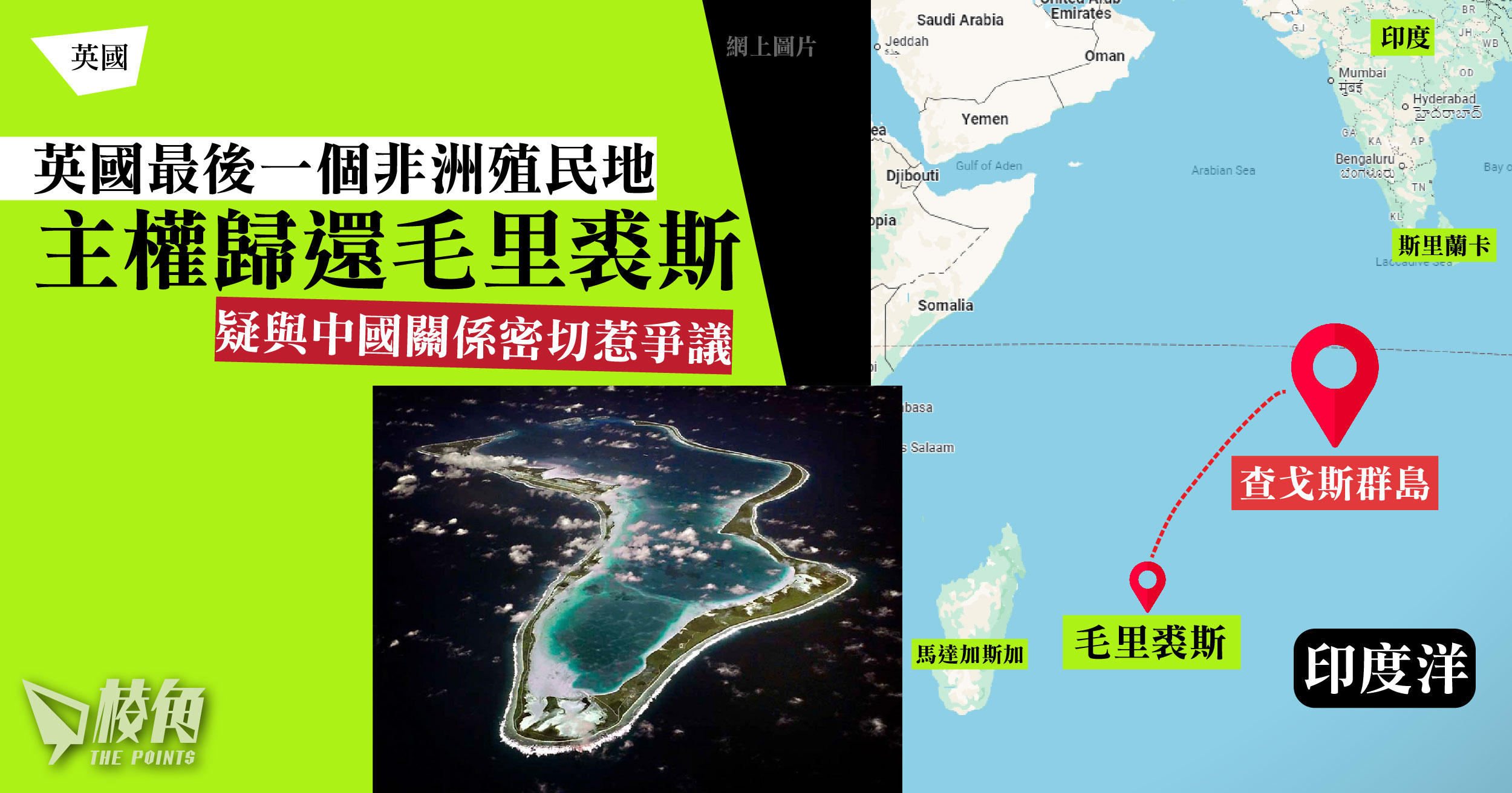 英國外交部周四(3日)宣布,將最後一個非洲殖民地查戈斯群島(Chagos Archipelago)的主權移交非洲國家毛里裘斯(Mauritius),結束59年的殖民統治。英國外相林德偉(David Lammy)稱,移交協議中保留英方在主島英美聯合空軍基地的使用權,期限為99年;並允許毛里裘斯重新安置當年被英政府強硬逼遷的原住民。有英國保守黨議員批評,執政工黨此舉猶如向中國投降,毛里裘斯與中國關係密切,兩國上月更簽訂本幣互換協議,規模達20億人民幣。