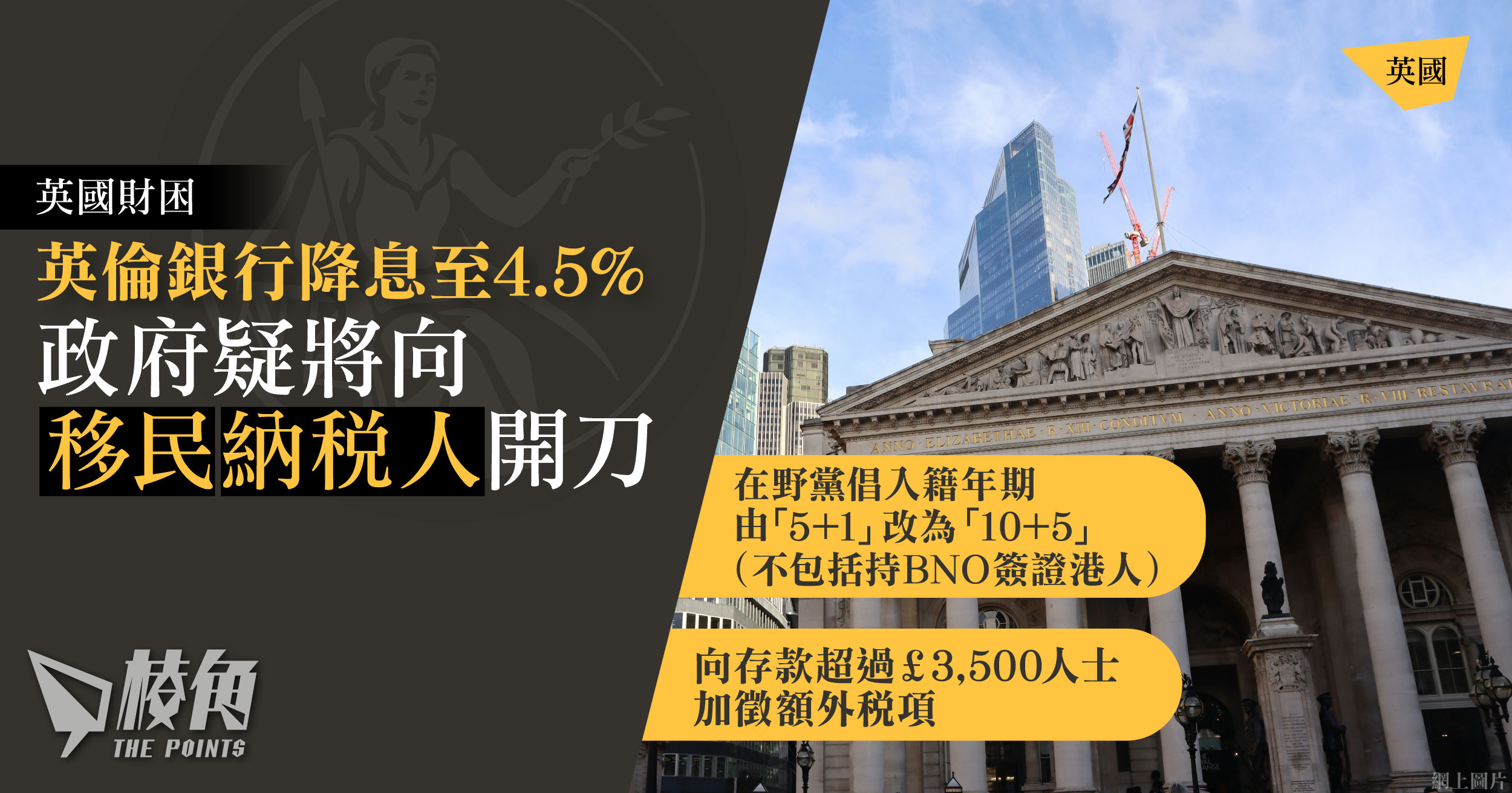 英倫銀行今年首度議息,面對經濟放緩及通貨膨脹等壓力,周四(6日)宣布減息四分一厘至4.5厘,並警告通脹率將大幅上升。同時,政府朝野均有動作紓緩國家財困,英國稅務海關總署(HMRC,下稱稅務署)據報將向存款起過3,500英鎊人士加徵額外稅項;在野保守黨黨魁栢丹娜(Kemi Badenoch)建議加長移民的入籍年期要求,由「5+1」改為「10+5」。不過,有港人向保守黨查詢,栢丹娜回覆指上述建議不包括持BNO簽證的移英港人。
