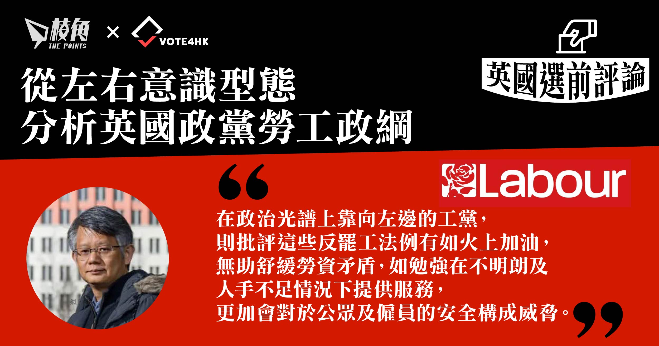 英國自2010年以後,一直是由右傾的保守黨執政,過去14年來,勞工政策基本上沒有什麼進展。英國近年一些重點的勞工政策,例如最低工資、集體談判及最高工時等,都是上任工黨政府執政期間訂立。相反,這兩年隨著英國生活成本上漲壓力,大規模罷工此起彼落,促使保守黨推出了壓抑罷工的立法新措施,被視為勞工政策的倒退。