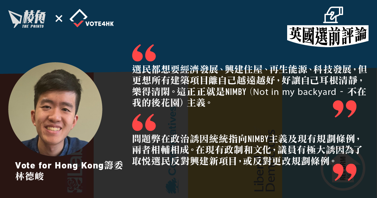 安於現狀使經濟發展停滯,使住屋價格愈發高企,樂了現在受為樓價租金持續上漲的有產階級,苦了眾多希望努力上進的年輕人。上車難的苦香港人受夠了。雖然英國的問題比香港輕,但問題持續惡化趨勢不斷,勢必禍延下一代。不發展經濟的結果可能就是民粹主義繼續醞釀,或令年輕一代認定高稅高福利多資助房屋為唯一出路。在本屆選舉,保守黨似乎已經放棄了修改規劃條例,專注取悅英格蘭東南方——保守黨傳統票倉——選民的支持者。工黨黨魁施紀賢 (Keir Starmer) 承諾大刀闊斧改革規劃條例,增加在棕地建屋,亦自詡YIMBY (NIMBY 的相反),或許可能得到年輕選民青睞。遙望大西洋對岸,加拿大保守黨似乎因重視興建房屋民望高企,勢必組成加拿大下任政府。例子說明改革規劃條例不限左右,但亟需政治決心及資本。改革路途定必會有失部分選民支持,所得的好處亦非一時三刻能得以彰顯,可能賠了自己的支持,最終只為下任作嫁衣裳。