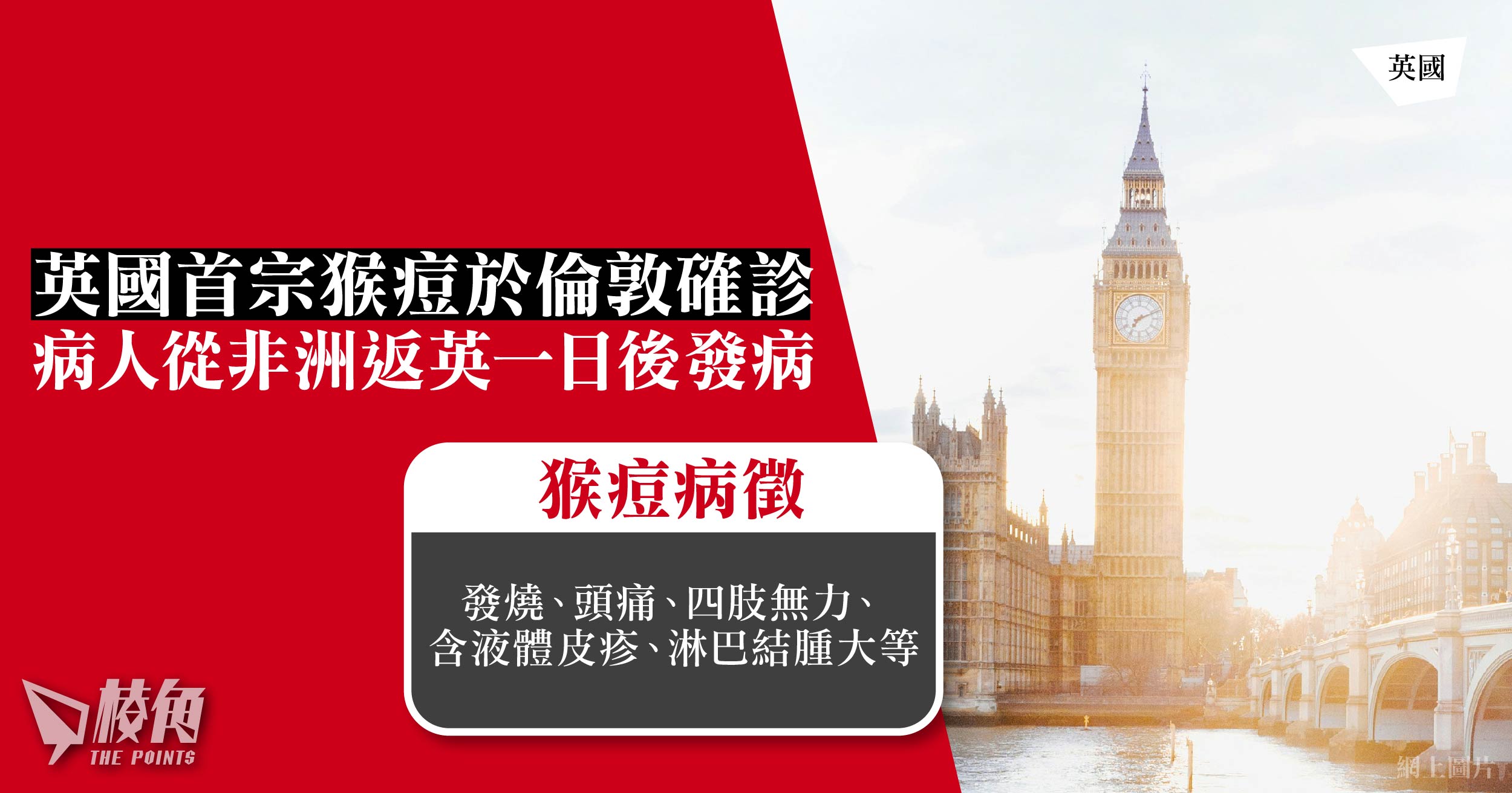 • 倫敦確診英國首宗猴痘新型病毒感染病例,患者曾到非洲國家旅遊