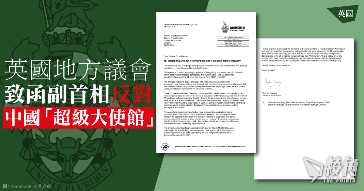 英國Wokingham地方議會於周一(28日)正式致函副首相韋雅蘭(Angela Rayner),表明反對中國在倫敦興建「超級大使館」。