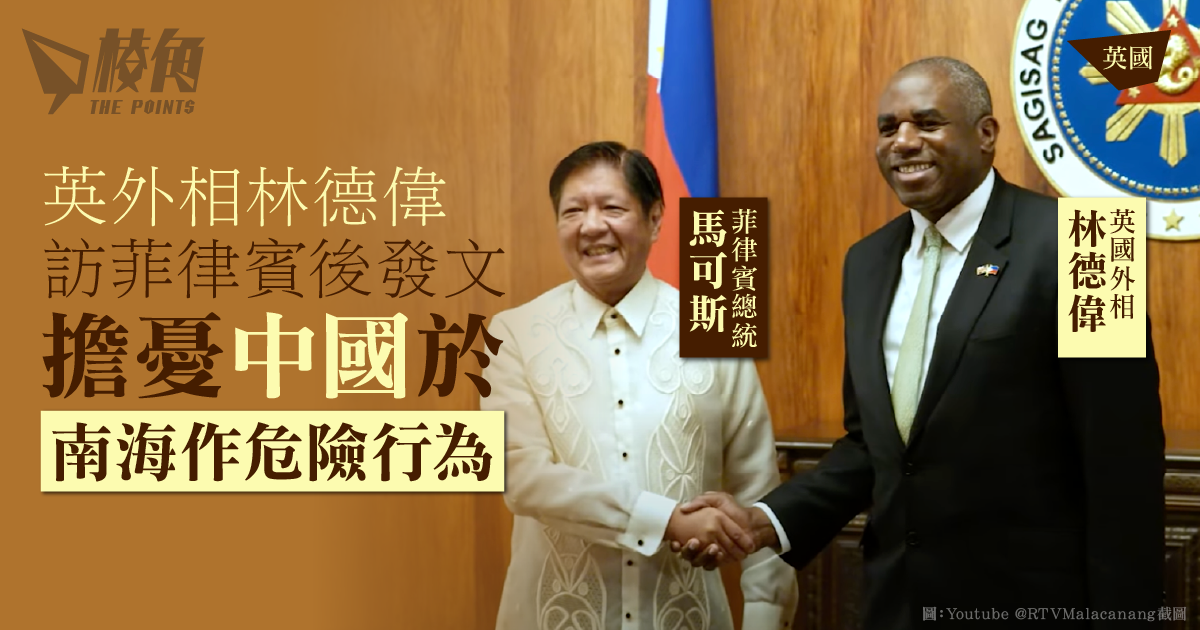 英國外相林德偉(David Lammy)上週出訪菲律賓,加強雙方就防禦和海事上的合作。近日南海緊張局勢升級,中、菲兩國衝突不斷,林德偉周一(10日)於社交平台發文表示,關注中國在南海的危險及破壞穩定的軍事行動;貼文又附上影片,林德偉在片中形容,中國的行為威脅菲律賓的航行自由及挑戰國際法。