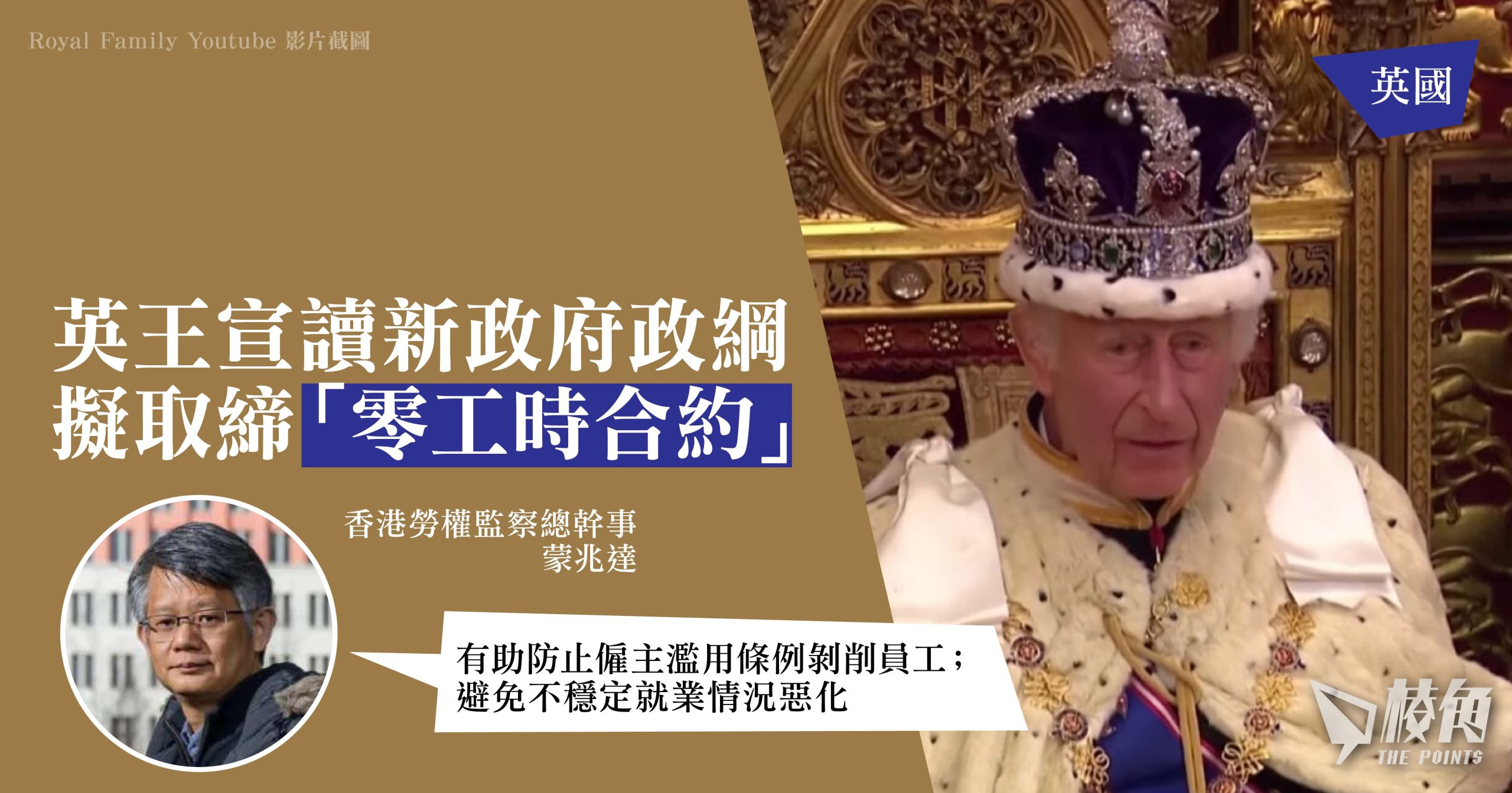 英國國會新會期周三(17日)開始,英王查理斯三世發表《國王演說》,宣讀新執政黨的施政方針及法案,首相施紀賢計劃推出逾35項法案,涵蓋勞工、物業、鐵路等,措施著重重振經濟、解決住屋和生活成本危機等社會問題。香港勞權監察總幹事蒙兆達表示歡迎法案,認為能有助防止僱主濫用條例剝削員工,避免不穩定就業情況惡化,但仍有待政府公布更多細節及改革力度。