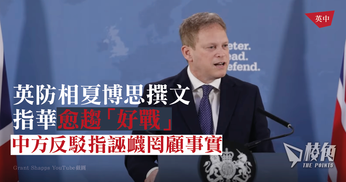 英國《每日電訊報》上周三(3日)刊登由國防大臣夏博思(Grant Shapps)撰寫的文章,就北約成立75周年分析國際局勢,當中提到來自俄羅斯對鄰國威脅持續,而中國亦變得愈來愈好戰(increasingly belligerent)。中國駐英國使館發言人周一(8日)堅決反對有關言論,批評英方政客罔顧事實,顛倒黑白,惡意誣衊中國,又奉勸英方政客收斂好鬥言論,停止無端指摘中國。