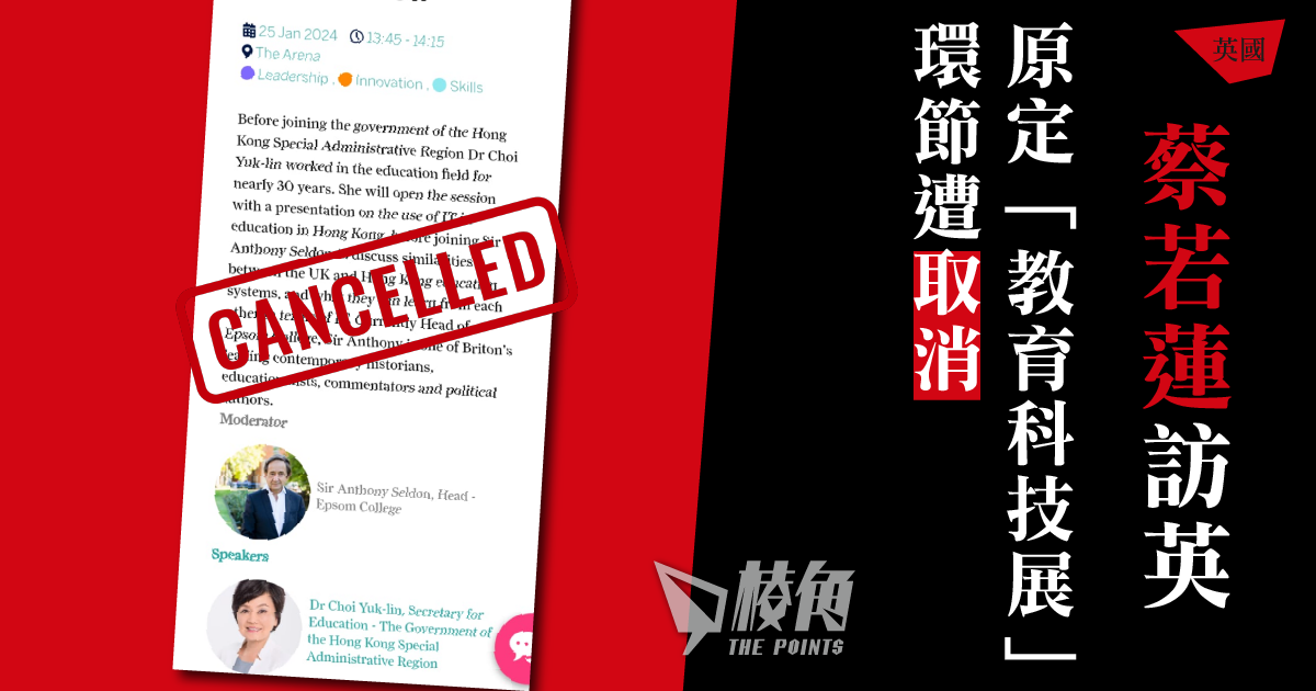 - 蔡若蓮原定周四出席英國教育科技展的環節被取消