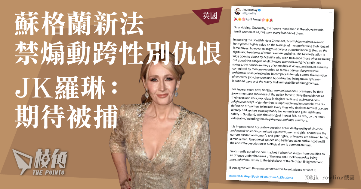 蘇格蘭議會於2021年通過《仇恨犯罪及公共秩序(蘇格蘭)法》(Hate Crime and Public Order (Scotland) Act),增加了針對年齡、殘疾、宗教、性取向、跨性別認同及雙性之仇恨犯罪刑責,煽動或意圖散播「可被合理認為具威脅或侮辱性」的訊息或行為,最高刑罰判囚7年,這條具爭議性的法例近日才生效。JK羅琳周一在社交平台X上連發帖文,以「愚人節笑話」諷刺10名跨性別罪犯、運動員、政界及演藝界人物,並強調這些跨性別者「完全不是女人」。
