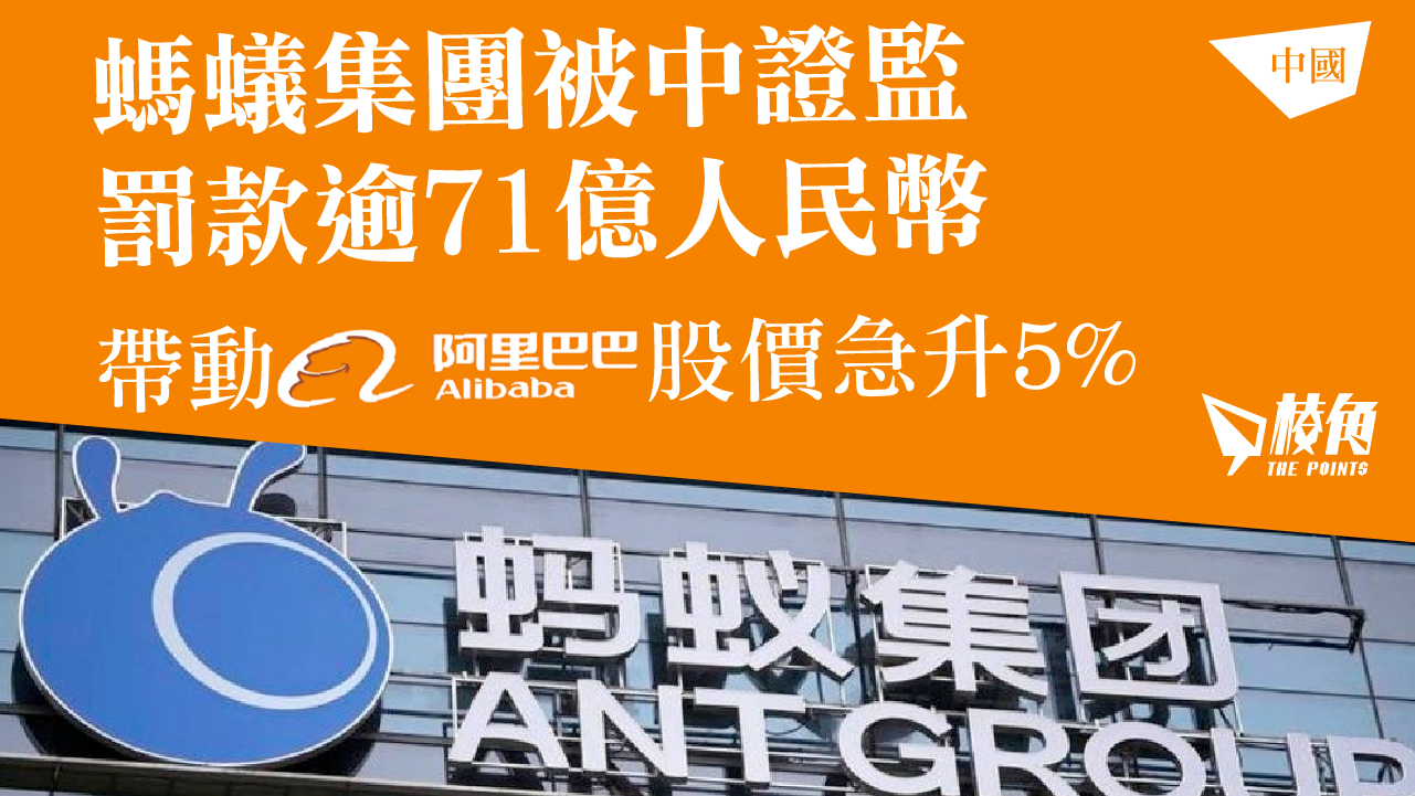 中證監於官網發聲明指,螞蟻集團及旗下機構在多項營商管理範疇出現違法行為,金融管理部門以違反《中國人民銀行法》《反洗錢法》《銀行業監督管理法》《保險法》《證券投資基金法》《消費者權益保護法》等,向集團收取(含沒收違法所得)71.23億人民幣罰款。消息傳出後,阿里巴巴-SWR(89988)股價急升5.079%,收市價為$79.65,為今日最高價。